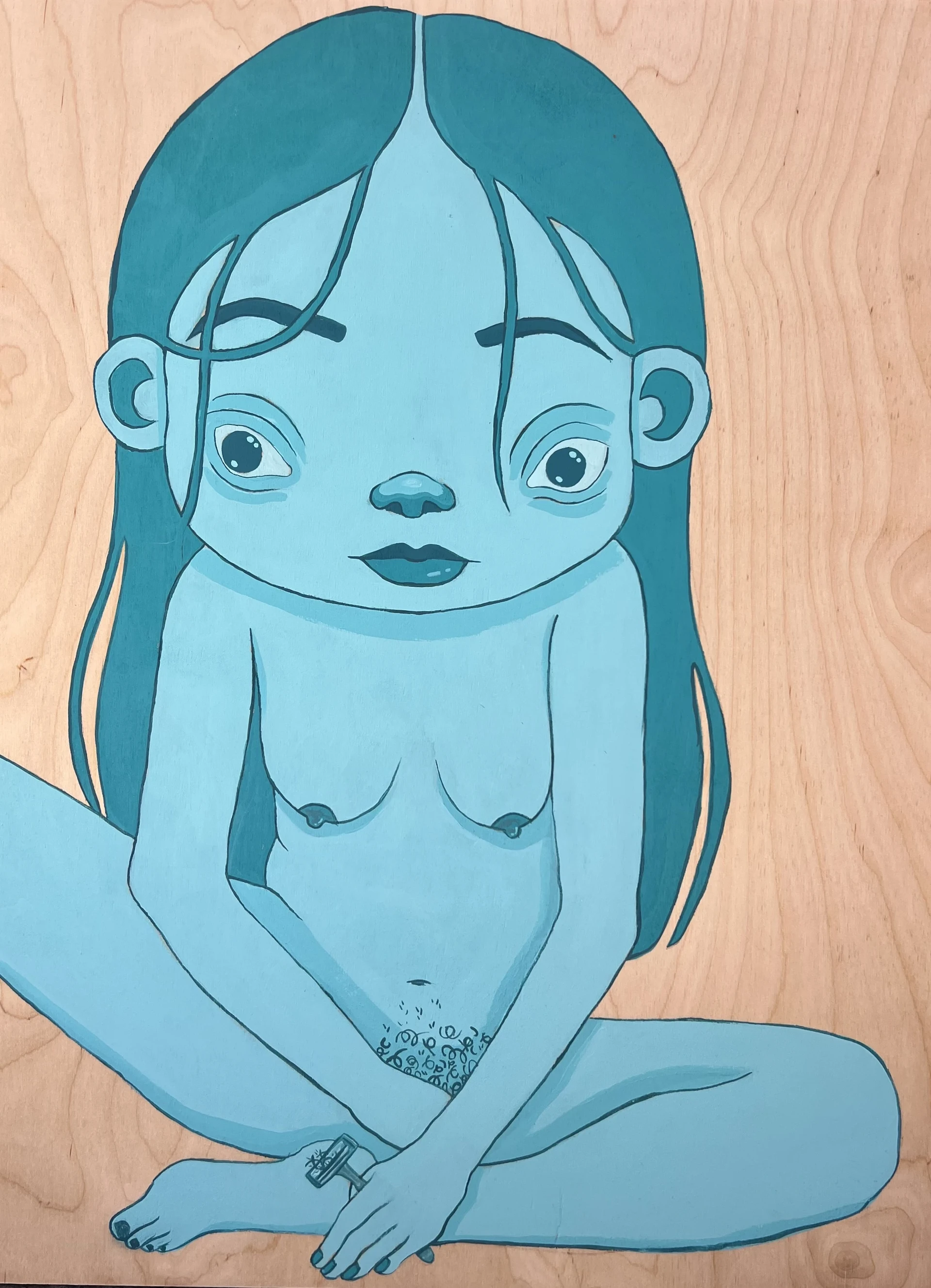 A painting representing the experience of developing curiosity around the razor found in the shower that you have seen your mother use growing up. The feeling of discomfort and shame around body hair on a woman.